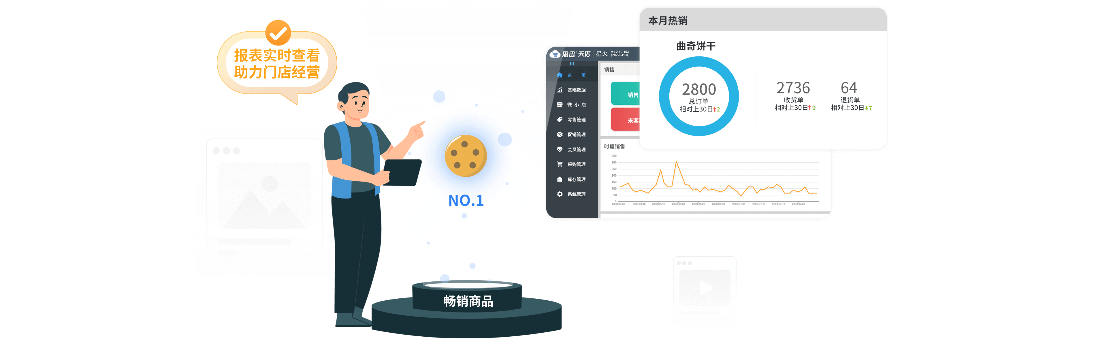 销售额、商品流水、毛利等各项经营数据的日、周、月汇总报表随时查看,滞销商品、