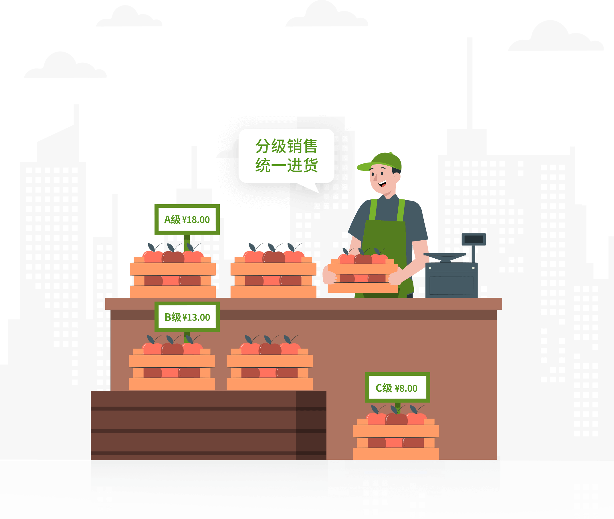 果蔬门店销售通常会有品级区分,同类商品分拣后按品相分类,级别不同售价也不同,