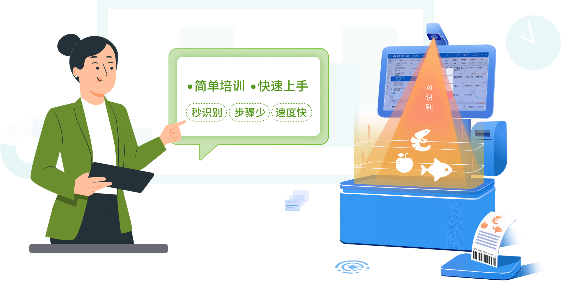 内嵌式AI识别,上秤秒速识别,准确率99.99%,员工仅需简单培训即可快速上手,