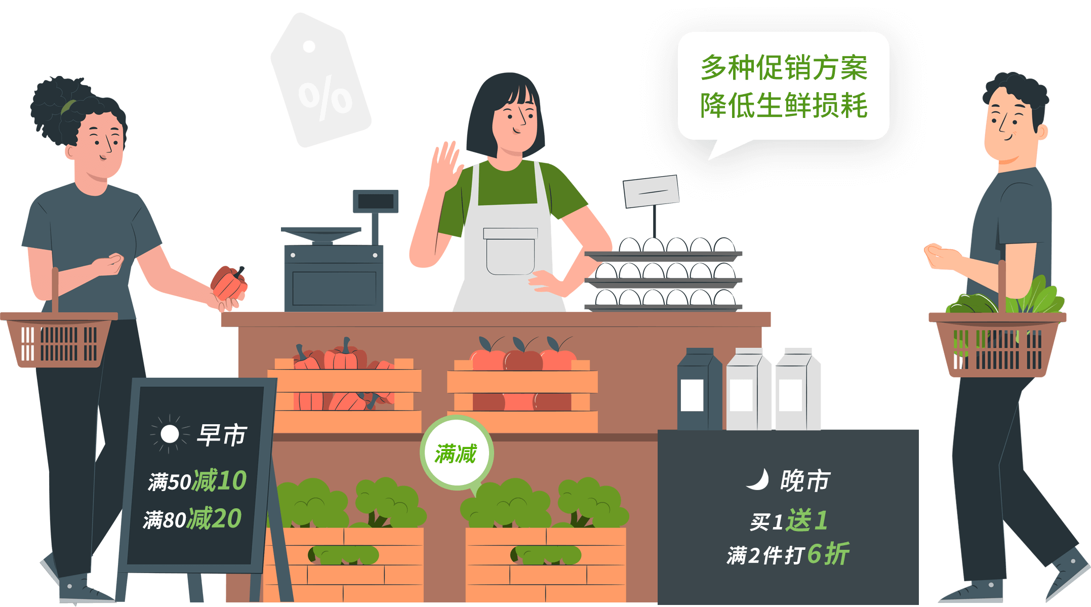 多种场景促销方案,帮助门店清理当日库存,降低生鲜损耗。